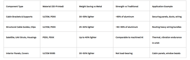 But advances in smart design strategies and new high-performance materials have flipped the script. Engineering-grade polymers like ULTEM™ 9085, PEEK, and PEKK not only meet aerospace flame, smoke, and toxicity (FST) standards [2][3][4] but also deliver impressive strength-to-weight ratios. Combined with design optimization, they’ve enabled the production of load-bearing components that were once thought impossible in plastics. For example, cabin brackets and supports made from ULTEM or PEKK are now replacing aluminum parts, cutting weight by 30–55% while still meeting the same load requirements [5]. Similarly, structural cable guides and clips are being printed to manage heavy wiring bundles, with parts showing strength within 90–95% of aluminum equivalents but at much lower density, leading to substantial fuel savings [6]. Beyond aircraft interiors, satellites and UAVs are increasingly using lightweight PEEK struts and housings, which are up to 40% lighter than machined aluminum yet capable of withstanding thermal swings from –150°C to +150°C and continuous vibration loads in orbit [7].